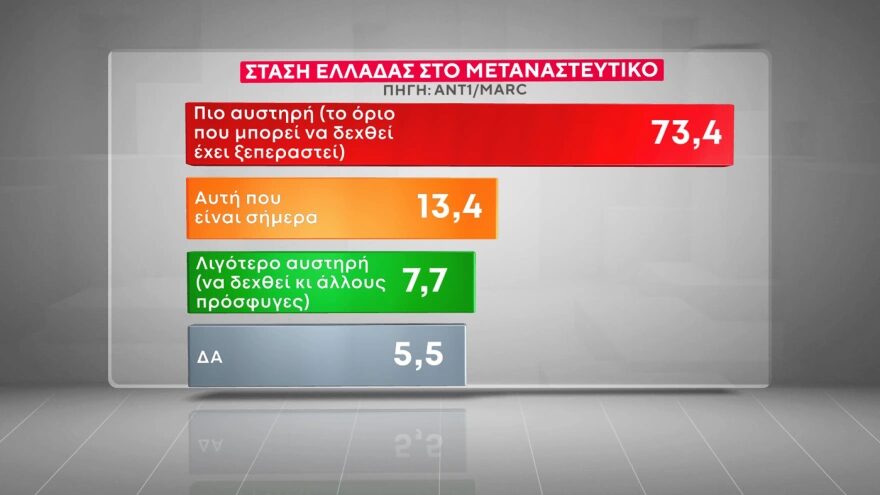 Σε ερώτηση για τη στάση της Ελλάδας στο μεταναστευτικό το 73,4% θέλει η στάση της Ελλάδας να είναι πιο αυστηρή, το 13,4% να είναι αυτή που είναι σήμερα, το 7,7% να είναι λιγότερο αυστηρή . Δεν απάντησε το 5,5%. Σε ότι αφορά τα κριτήρια της ψήφου στις εθνικές εκλογές, η πλειοψηφία (43,7%) απάντησε πως θα επέλεγε με βάση την οικονομία και το βιοτικό επίπεδο.