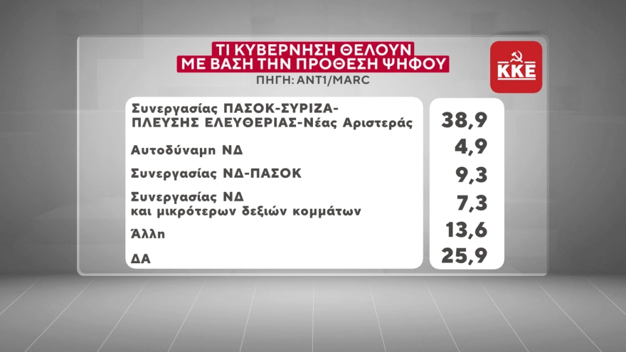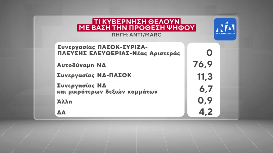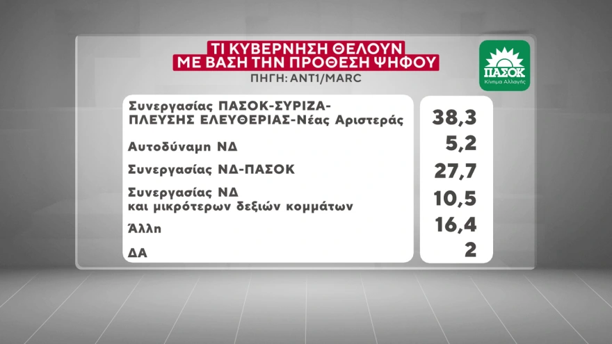 Στο «τι κυβέρνηση θέλουν με βάση την πρόθεση ψήφου» τα αποτελέσματα που εξάγονται από την δημοσκόπηση είναι τα παρακάτω: Η πλειοψηφία των ψηφοφόρων της ΝΔ επιθυμεί αυτοδύναμη ΝΔ. Η πλειοψηφία των ψηφοφόρων του ΣΥΡΙΖΑ επιθυμεί συνεργασία ΠΑΣΟΚ – ΣΥΡΙΖΑ – Πλεύση Ελευθερίας – Νέας Αριστεράς. Στο ΠΑΣΟΚ οι ψηφοφόροι είναι διαιρεμένοι και επιθυμούν στο 38,3% συνεργασία ΠΑΣΟΚ – ΣΥΡΙΖΑ – Πλεύση Ελευθερίας – Νέα Αριστερά ενώ το 27,7% επιθυμεί συνεργασία ΝΔ – ΠΑΣΟΚ