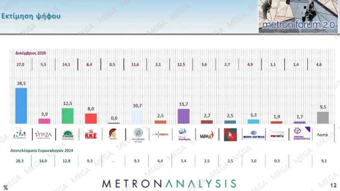 Στην εκτίμηση ψήφου η Metron Analysis δίνει τη Νέα Δημοκρατία με άνοδο στο 28,5, το ΠΑΣΟΚ με υποχώρηση στο 12,5%, την Πλεύση Ελευθερίας επίσης σε υποχώρηση στο 11,7% όπως και την Ελληνική Λύση στο 10,7%, ενώ δίνει σε άνοδο τα «Λοιπά».