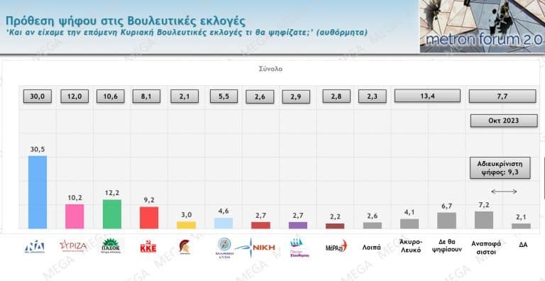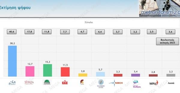 Στην εκτίμηση ψήφου η διαφορά της ΝΔ από το δεύτερο ΠΑΣΟΚ είναι 22,9 μονάδες. Συγκεκριμένα η ΝΔ συγκεντρώνει 38,2% , οριακά κάτω από τα ποσοστά των εκλογών του Ιουνίου ενώ το ΠΑΣΟΚ ξεπερνά τα ποσοστά του κατά 3,5 μονάδες φθάνοντας το 15,3%.