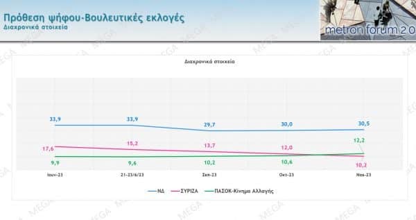 Οι απώλειες για τον ΣΥΡΙΖΑ συνεχίζονται και συγκριτικά με τον Οκτώβριο το κόμμα της αξιωματικής αντιπολίτευσης χάνει επιπλέον 1,8% και φθάνει το 10,2% στην πρόθεση ψήφου. Το ΠΑΣΟΚ κερδίζει 1,6% συγκριτικά με τον Οκτώβριο και φθάνει στο 12,2% και καταγράφεται ως δεύτερη δύναμη δημοσκοπικά. Κέρδη 0,5% καταγράφει και η ΝΔ αγγίζοντας το 30,5%.