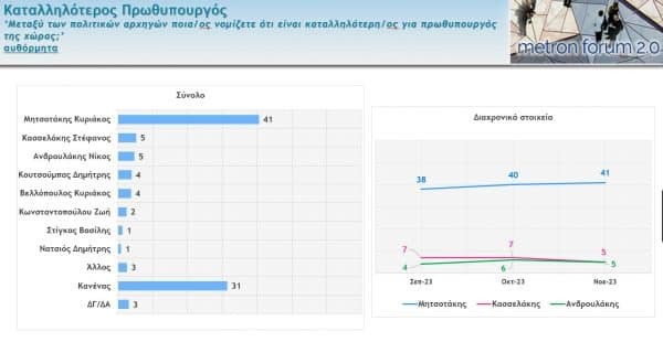 Ο Κυριάκος Μητσοτάκης πέρασε ξανά πρώτος σε δημοτικότητα από τους πολιτικούς αρχηγούς με 48% θετικές γνώμες και 49% αρνητικές. Ακολουθεί ο γ.γ. του ΚΚΕ Δημήτρης Κουτσούμπας (ήταν στην πρώτη θέση στην προηγούμενη έρευνα της Metron τον Οκτώβριο) με ισοσκελισμένες θετικές και αρνητικές ψήφους (45-45%). Στην τρίτη θέση ο πρόεδρος του ΠΑΣΟΚ Νίκος Ανδρουλάκης με 52% αρνητικές και 39% θετικές, ακολουθεί η Ζωή Κωνσταντονοπούλου και στην 5η θέση ο Στέφανος Κασσελάκης με 70% αρνητικές ψήφους και μόλις 23% θετικές.