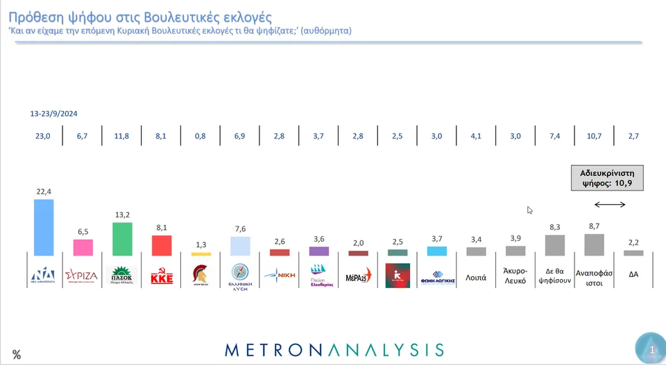 Στην πρόθεση ψήφου για βουλευτικές εκλογές, η ΝΔ κινείται στο 22,4%. Το ΠΑΣΟΚ δεύτερο με 13,2%, το ΚΚΕ στην τρίτη θέση με 8,1%, η Λύση τέταρτη με 7,6%, πέμπτος ο ΣΥΡΙΖΑ με 6,5% και ακολουθούν: Φωνή Λογικής με 3,7%, Πλεύση με 3,6%, Νίκη με 2,6%, Νέα Αριστερά με 2,5%, ΜέΡΑ25 με 2% και Σπαρτιάτες με 1,3%. Η αδιευκρίνιστη ψήφος ανέρχεται στο 10,9% (8,7% δηλώνουν αναποφάσιστοι και 2,2% δεν απαντούν. Δεν θα ψηφίσει απαντά το 8,3%, άκυρο/λευκό το 3,9%, λοιπά κόμματα 3,4%.
