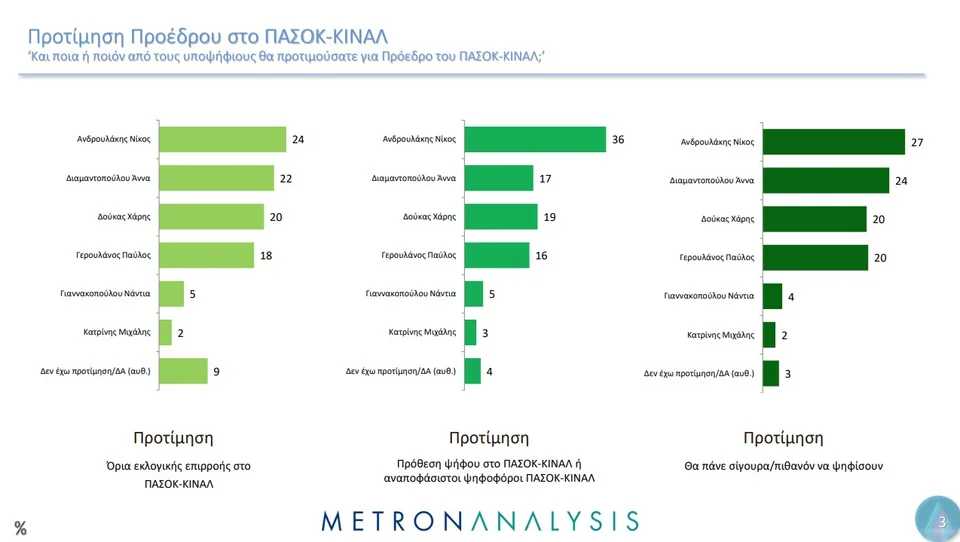 Στις εσωκομματικές του ΠΑΣΟΚ, ο Ανδρουλάκης παραμένει το φαβορί, ενώ η Α. Διαμαντοπούλου κάνοντας ντεμαράζ ανεβαίνει στην δεύτερη θέση σε όσους δηλώνουν ότι θα πάνε να ψηφίσουν. Εντυπωσιακή άνοδο και για τον Παύλο Γερουλάνο που ισοβαθμεί με τον Χάρη Δούκα στην τρίτη θέση.