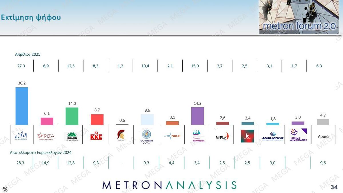 Στην εκτίμηση ψήφου,ξεπερνά το 30% και φτάνει το 30,4%, ούσα σχεδόν 14 μονάδες μπροστά από τη δεύτερη θέση, από την οποία και αυξάνει τη διαφορά. Στη δεύτερη θέση, η Πλεύση Ελευθερίας στο 16%. Τρίτο είναι το ΠΑΣΟΚ, το οποίο, μετά από μήνες που σημειωνόταν μείωση της δύναμής του, ανεβάζει την επίδοσή του από το 13% στο 13.5%.