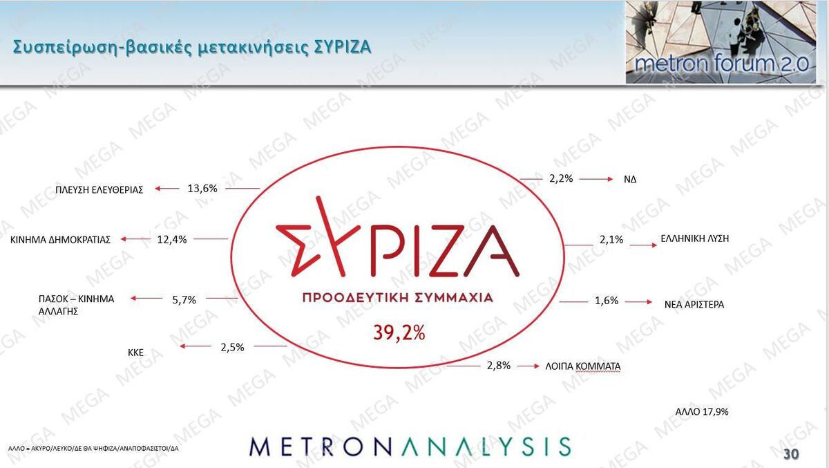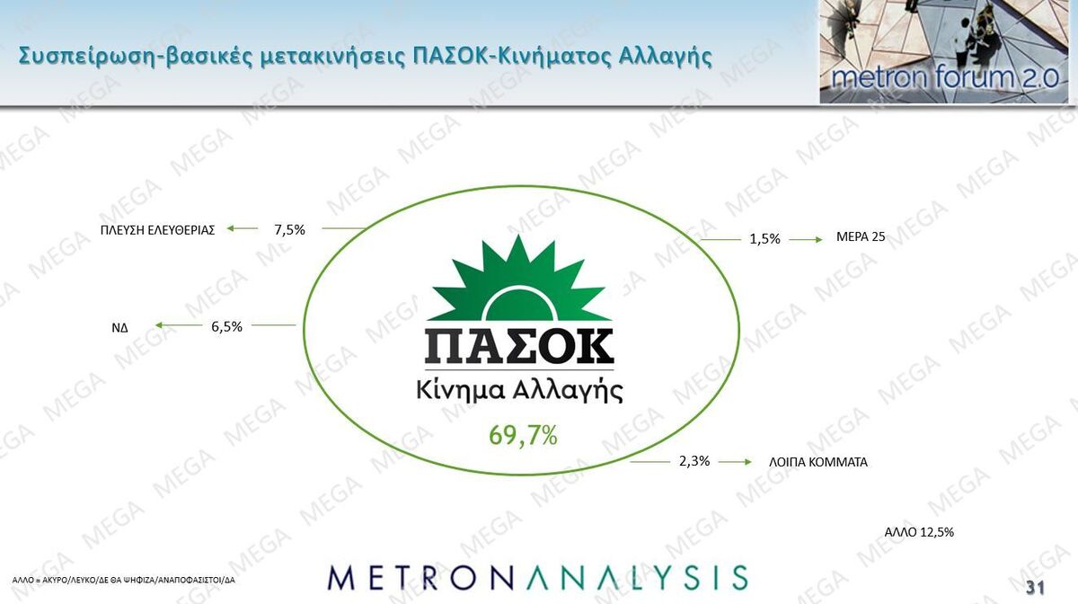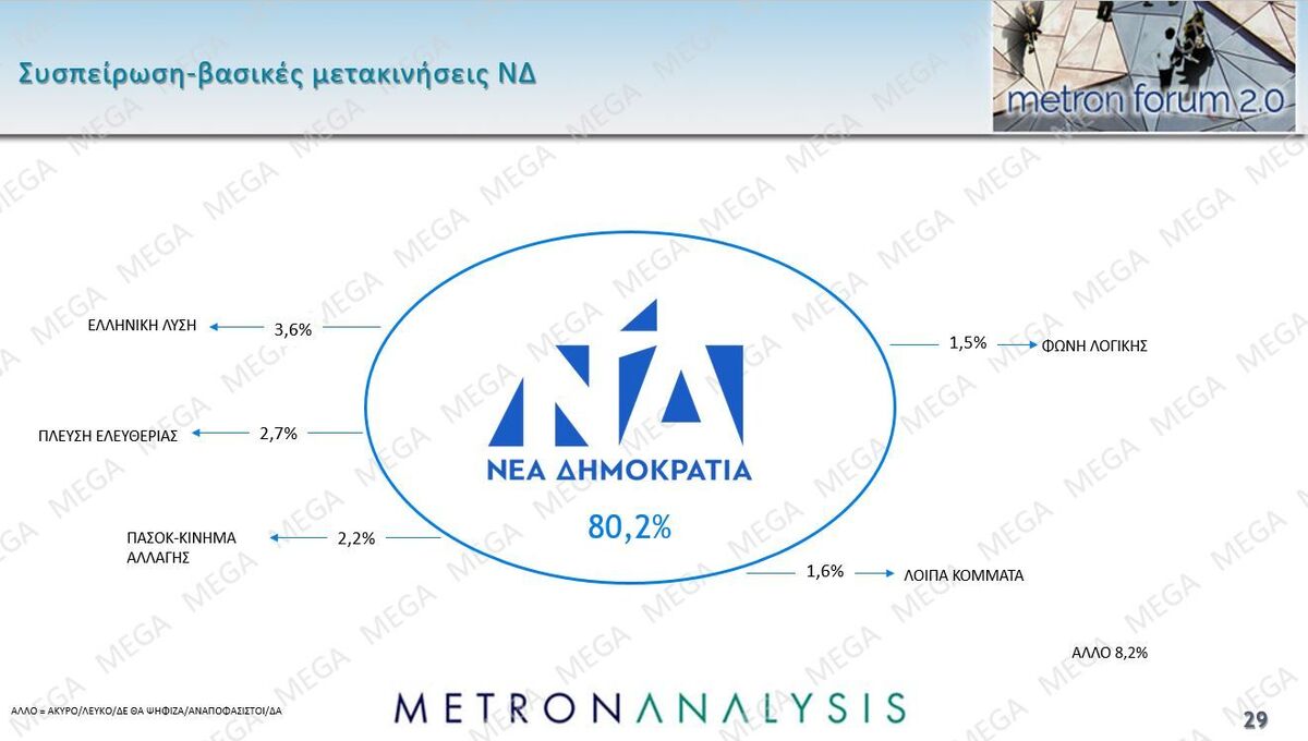 Στην πρόθεση ψήφου επί των εγκύρων οι επιδόσεις είναι : Ν.Δ 25.4%, ΠΛΕΥΣΗ ΕΛΕΥΘΕΡΙΑΣ 13.4% , ΠΑΣΟΚ 11.2%, ΕΛΛΗΝΙΚΗ ΛΥΣΗ 8%, Κ.Κ.Ε 6.9%, ΣΥΡΙΖΑ 4.8%, ΝΙΚΗ 2.4%, ΦΩΝΗ ΛΟΓΙΚΗΣ 2.4%, ΚΙΝΗΜΑ ΔΗΜΟΚΡΑΤΙΑΣ 2.4%, ΜΕΡΑ 25 2%, ΝΕΑ ΑΡΙΣΤΕΡΑ 1%, ΣΠΑΡΤΙΑΤΕΣ 0.8%. Σημειώνεται ότι το 2.4% δηλώνει άκυρο/ λευκό, το 6.3% αποχή και το 14.9% αναποφάσιστοι.
