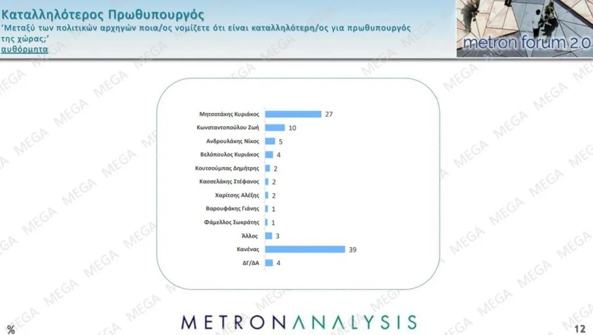 Όσον αφορά την καταλληλότητα για πρωθυπουργός ο Κυριάκος Μητσοτάκης παραμένει καταλληλότερος με ποσοστό 27%. Ακολουθεί πίσω με 10% η Ζωή Κωνσταντοπούλου, ο Ν. Ανδρουλάκης με 5%. Ο «κανένας» συγκεντρώνει 39%.