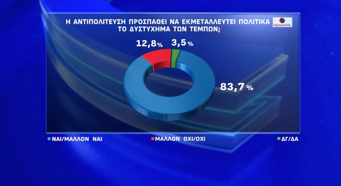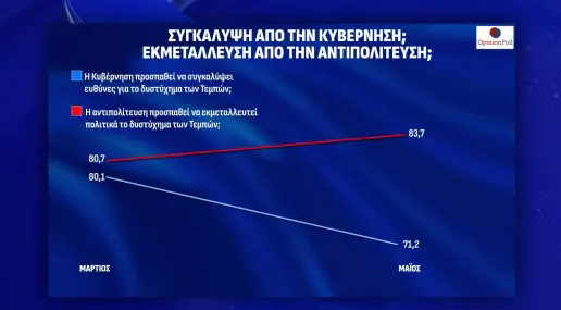 Το 83.7% θεωρεί ότι η Αντιπολίτευση προσπαθεί να εκμεταλλευτεί πολιτικά το δυστύχημα των Τεμπών ( Τον Μάρτιο ήταν 80.7%). Υπάρχει αύξηση δηλαδή κατά 3%. Την αντίθετη άποψη έχει το 12.8%.
