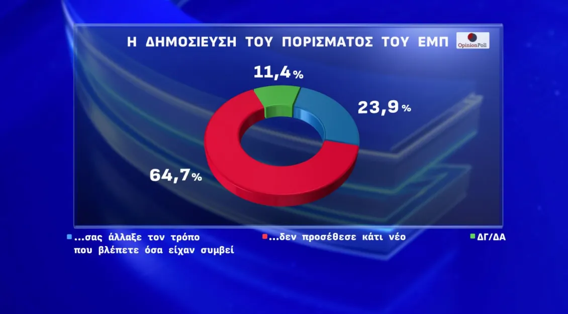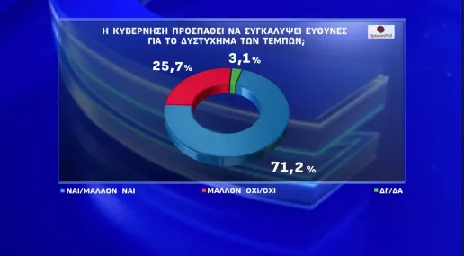 Σε σχέση με την τραγωδία των Τεμπών, τo 23.9% δηλώνει ότι προβληματίστηκε από πρόσφατες εξελίξεις, όπως για παράδειγμα το « πόρισμα Καρώνη» και άλλαξε η οπτική στο πως έβλεπαν όσα ακούγονταν. Το 64.7% θεωρεί ότι δεν έχουν προστεθεί νέα δεδομένα που να αλλάζει την γνώμη τους. Το 71.2% θεωρεί ότι προσπαθεί να συγκαλύψει ευθύνες για τα Τέμπη , ενώ το 25,7% έχει αντίθετη άποψη.