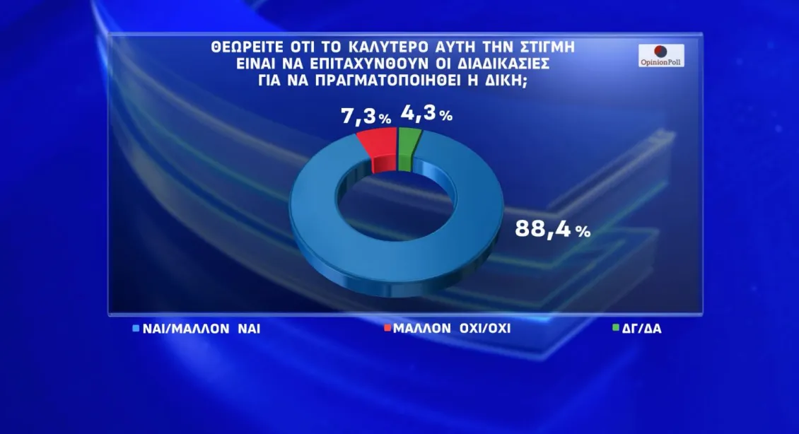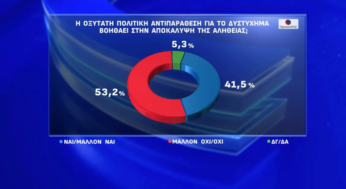 Το 53.2% πιστεύει ότι η συνεχής πολιτική αντιπαράθεση για τα Τέμπη δεν βοηθάει στην αποκάλυψη της αλήθειας, ενώ το 41.5% έχει αντίθετη άποψη. Το 88.4% θεωρεί ότι το καλύτερο που έχει να γίνει αυτή την στιγμή είναι να επιταχυνθούν οι διαδικασίες ώστε να γίνει η δίκη και η Δικαιοσύνη να αποκαλύψει την αλήθεια και να τιμωρήσει την αλήθεια. Αντίθετη άποψη έχει το 7.3%.