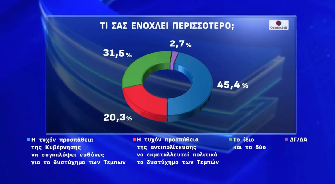 Το 45% δηλώνει ότι το ενοχλεί περισσότερο η τυχόν προσπάθεια η Κυβέρνηση να προσπαθεί να συγκαλύψει, το 20.3% η τυχόν προσπάθεια να εκμεταλλευτεί πολιτικά την τραγωδία η Αντιπολίτευση , ενώ το 31.5% δηλώνει ότι ενοχλείται εξίσου και από τα δύο.