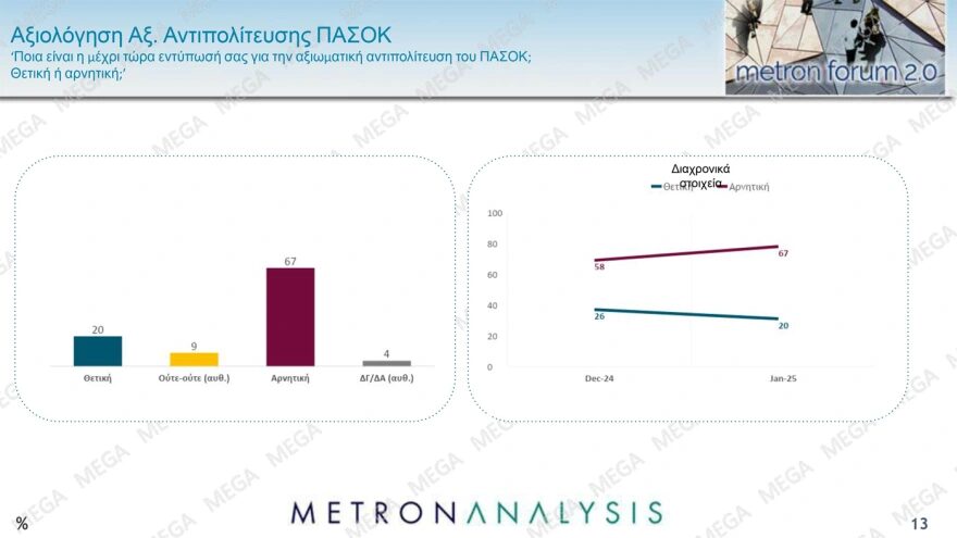 Την ίδια στιγμή, το 67% των πολιτών αποτιμά αρνητικά το ΠΑΣΟΚ, με μόλις 20% να έχει θετική γνώμη για την αξιωματική αντιπολίτευση.