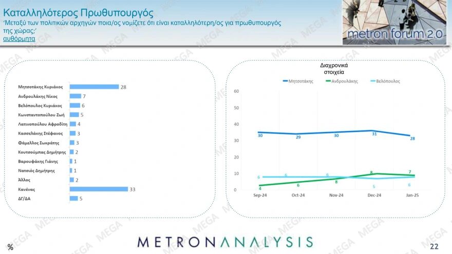 Ο Κ. Μητσοτάκης παραμένει μακράν καταλληλότερος πρωθυπουργός με 28%, ενώ πρώτος είναι ο «κανένας» με 33%. Ακολουθούν πολύ μακριά οι Ν. Ανδρουλάκης με 7%, Κ. Βελόπουλος 6%, Ζωή Κωνσταντοπούλου 5%, Αφρ. Λατινοπούλου 4%, Σ. Φάμελλος και Στ. Κασσελάκης 3%.