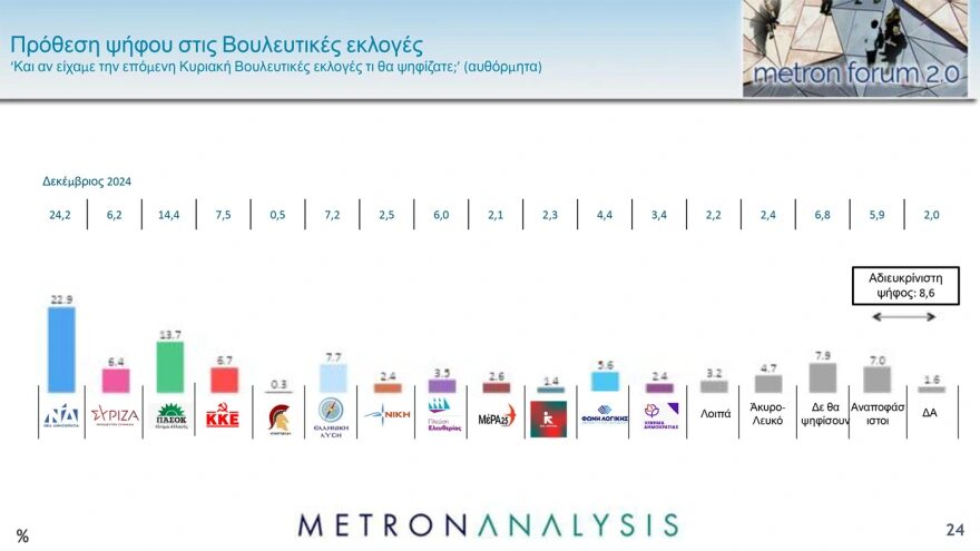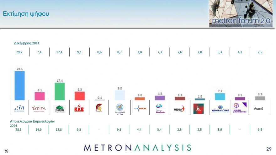 Στην πρόθεση ψήφου 22,9% συγκεντρώνει η Νέα Δημοκρατία, ενώ το ΠΑΣΟΚ συγκεντρώνει 13, 7% και παραμένει δεύτερο κόμμα. Η σημαντική πτώση του Νίκου Ανδρουλάκη αντανακλά προφανώς τις επιπτώσεις της συζήτησης περί μετεκλογικών συνεργασιών που ξεκίνησε αμέσως μετά την επιλογή Τασούλα για την προεδρία της Δημοκρατίας και δίχασε το ΠΑΣΟΚ. Μεγάλη πτώση καταγράφηκε και στην δημοτικότητα του Σωκράτη Φάμελλου, ο οποίος χάνει 11 μονάδες σε σχέση με την περίοδο της εκλογής του στην προεδρία του ΣΥΡΙΖΑ.