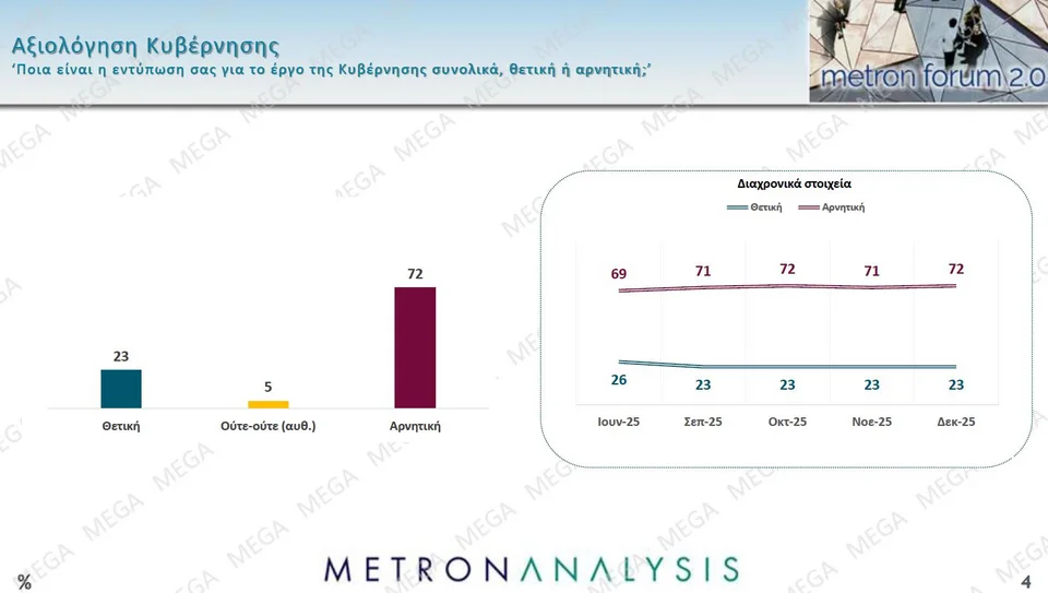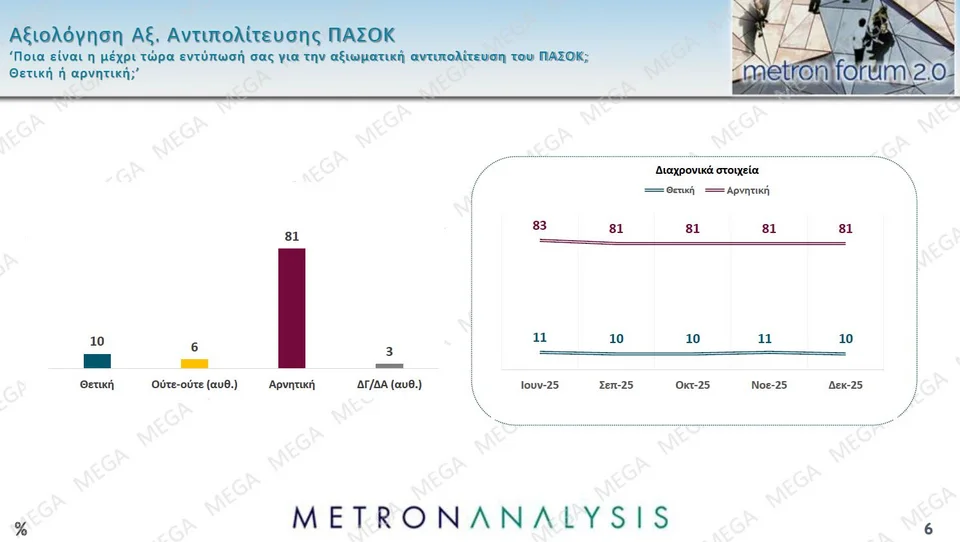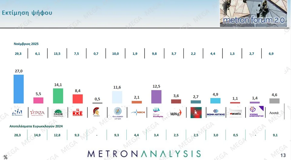 Η κυβέρνηση φτάνει στο 27% (είχε 29,3% τον Νοέμβριο) με το ΠΑΣΟΚ να ακολουθεί με 14,1% παρουσιάζοντας κέρδη 1,5 περίπου μονάδας , ενώ κέρδη προκύπτουν και για την Πλεύση Ελευθερίας (12,5% με άνοδο 2,7 μονάδων), αλλά και την Ελλ. Λύση (11,6%). Ακολουθούν ΚΚΕ (8,4%), ΣΥΡΙΖΑ (5,5%), Φωνή Λογικής (4,9%) και ΜεΡΑ25 (3,6%)