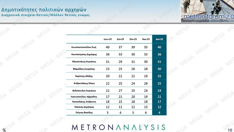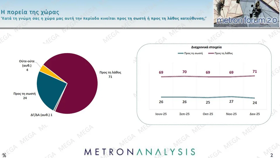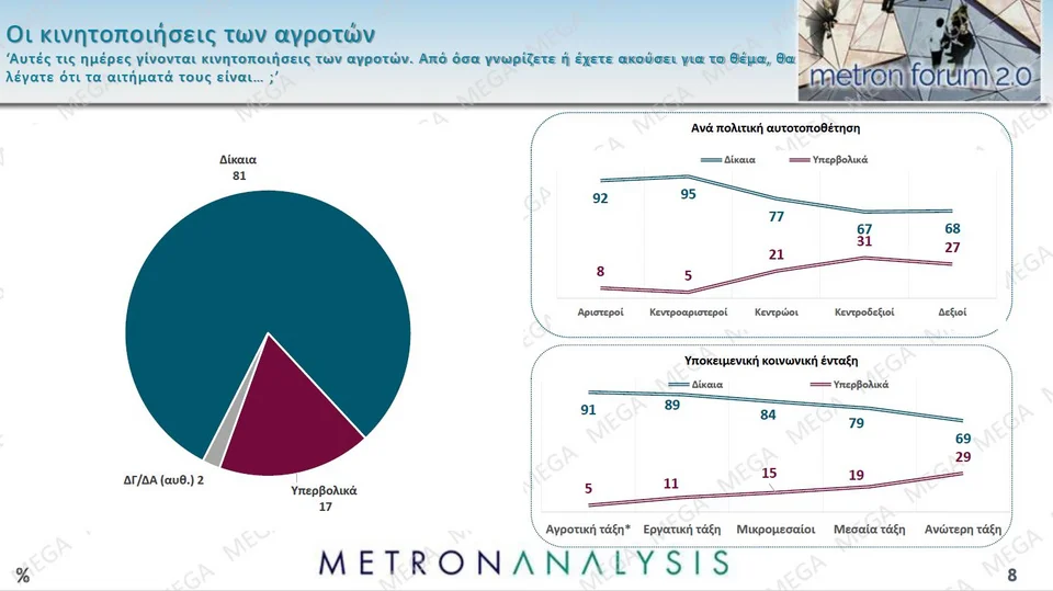 Στην καταλληλότητα για πρωθυπουργός, ο Κ. Μητσοτάκης εξακολουθεί να είναι με διαφορά πρώτος με 26%, έναντι 8% της Ζωής Κωνσταντοπούλου. Στους αγρότες, οι 8 στους 10 πολίτες κρίνει ως δίκαιες τις κινητοποιήσεις τους για τα αιτήματά τους Τέλος, οι πολίτες κρίνουν δικαιολογημένη κατά 63% την μορφή των κινητοποιήσεων των αγροτών