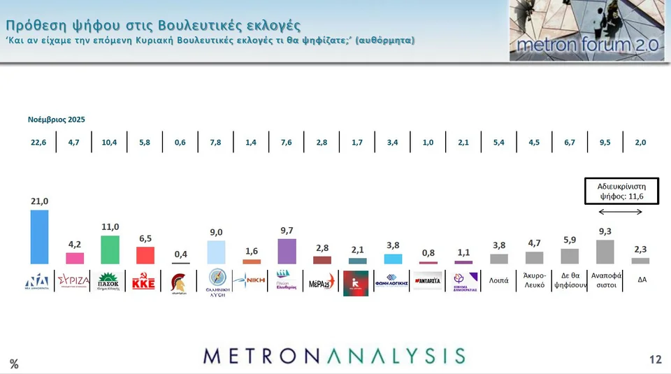 Στην πρόθεση ψήφου, η ΝΔ είναι στο 21%, δέκα μονάδες πάνω από το ΠΑΣΟΚ (11%). Ακολουθούν Πλεύση Ελευθερίας (9,7%), Ελλ. Λύση (9%), ΚΚΕ (6,5%), ΣΥΡΙΖΑ (4,2%) και Φωνή Λογικής (3,8%).