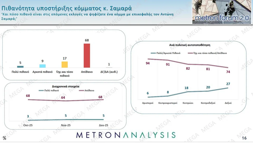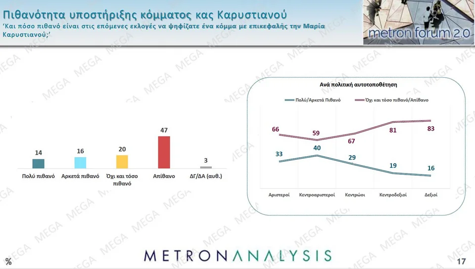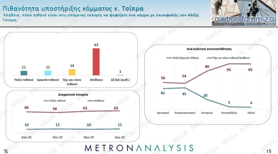 Στην πιθανότητα στήριξης του Αλ. Τσίπρα στις επόμενες εκλογές, δεν σκοπεύει να τον ψηφίσει λέει το 63% ενώ με τους «πιθανόν όχι» το ποσοστό φτάνει το 77%. Αντίθετα, 11% λέει πολύ πιθανό και το ίδιο ποσοστό δηλώνει πως είναι αρκετά πιθανό. Για τη Μαρία Καρυστιανού που το 30% βλέπει πολύ ή αρκετά πιθανό να την ψηφίσει Στο 14% είναι το αντίστοιχο ποσοστό για τον Αντώνη Σαμαρά.