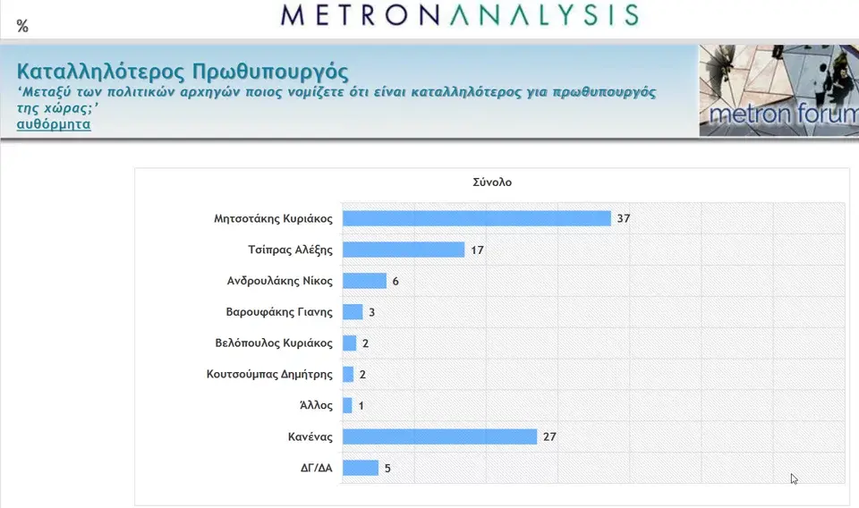 Ο Κυριάκος Μητσοτάκης θεωρείται καταλληλότερος πρωθυπουργός με 37%, ποσοστό υπερδιπλάσιο από εκείνο του Αλέξη Τσίπρα (17%),
