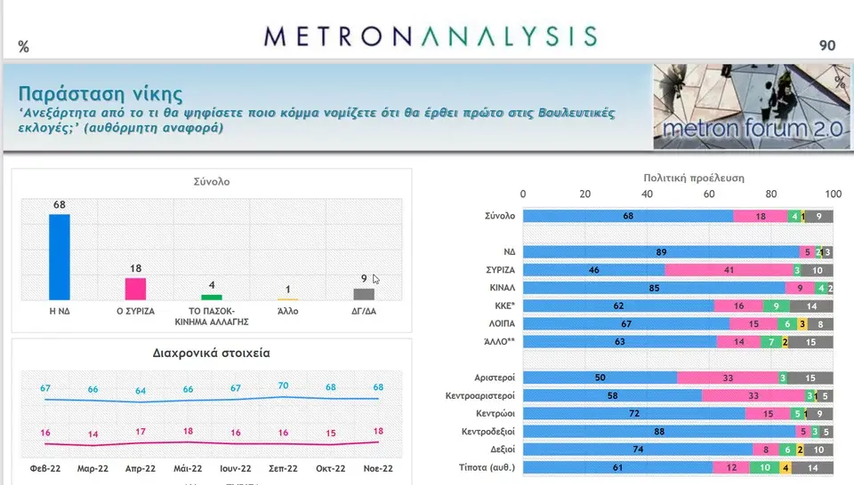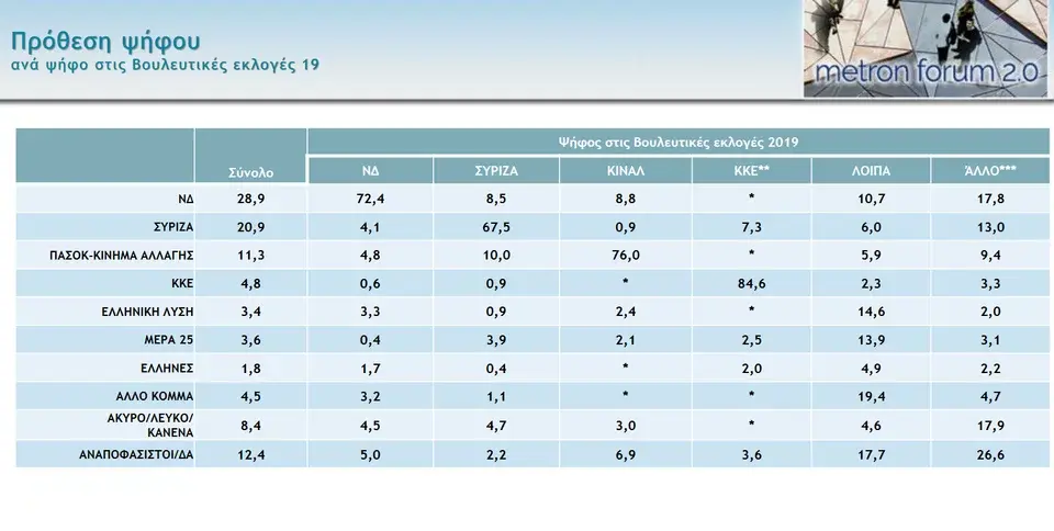 Σύμφωνα με την πανελλαδική μέτρηση, η διαφορά της ΝΔ από τον ΣΥΡΙΖΑ στην πρόθεση ψήφου είναι 8 ποσοστιαίες μονάδες (28,9% έναντι 20,9% για το κόμμα της αξιωματικής αντιπολίτευσης) ενώ στην εκτίμηση ψήφου, το κυβερνών κόμμα η διαφορά εκτοξεύεται στο 10,2%. Η ΝΔ συγκεντρώνει ποσοστό 36,5% φλερτάροντας με την αυτοδυναμία, τουλάχιστον στις δεύτερες κάλπες, ενώ ο ΣΥΡΙΖΑ μένει στο 26,3%. Σε άνοδο και το ΠΑΣΟΚ που συγκεντρώνει ποσοστό 14,2%.