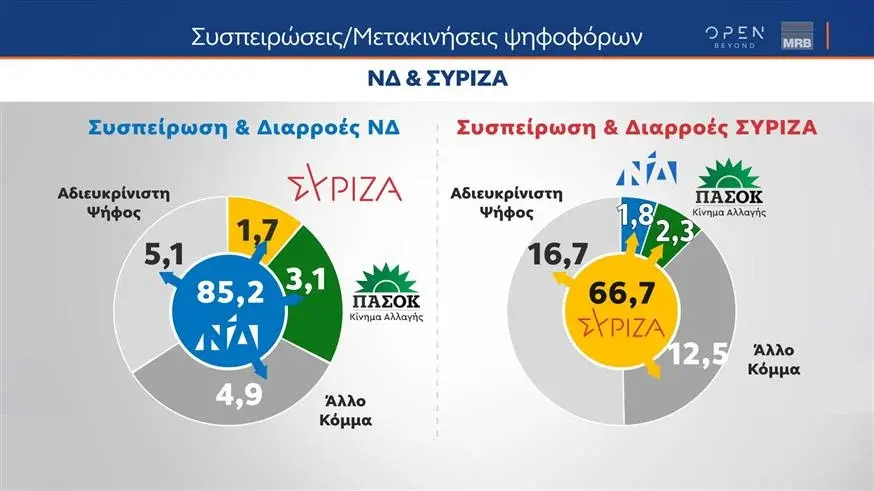 Στον ΣΥΡΙΖΑ, πάλι, παρότι βλέπουμε να διατηρεί σταθερό το ποσοστό του, παρουσιάζει χαμηλή συσπείρωση, με ποσοστό 66.7%. Το κόμμα τις αξιωματικής αντιπολίτευσης δίνει διαρροές προς άλλα κόμματα, με ένα 12.5% των ψηφοφόρων του να δηλώνει ότι θα ψηφίσει άλλο κόμμα, την ίδια στιγμή, όμως, και οι εισροές του έχουν ενδιαφέρον, καθώς, όπως φαίνεται, ο ΣΥΡΙΖΑ χάνει αλλά και παίρνει περίπου τα ίδια, και αυτό σημαίνει μία ανακατάταξη στη δομή του κόμματος.