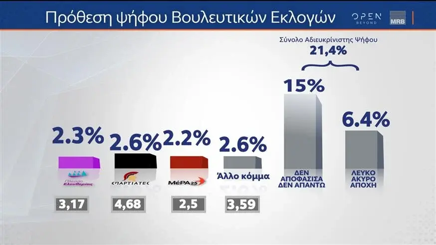 Αυτό που έχει σημασία στην πρόθεση ψήφου είναι ότι, για τόσο σύντομο χρονικό διάστημα μετά τις εκλογές, έχουμε πολύ μεγάλη αδιευκρίνιστη ψήφο, πράγμα που σημαίνει ότι, ο κόσμος, έχει αρχίσει και δημιουργεί μία απόσταση. Η αδιευκρίνιστη ψήφος φτάνει το 21.4%- νούμερο πολύ μεγάλο το οποίο πρέπει κανείς να λαμβάνει υπόψη του. Από την αναγωγή αυτό που πρέπει να κρατήσουμε είναι ότι, ο ΣΥΡΙΖΑ, κρατάει το ποσοστό του αλλά υπάρχουν δύο κόμματα τα οποία ανεβαίνουν σημαντικά. Είναι το ΚΚΕ από το περίπου 7.5% πάει στο 9% και η Ελληνική Λύση, που από το 4,44% πάει στο 7.3%.