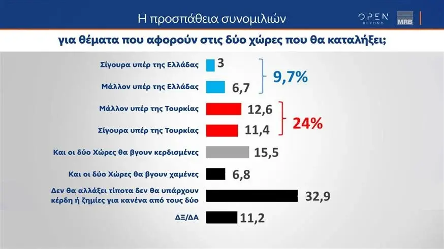 Το 40.3% του πληθυσμού δηλώνει ότι ο πρωθυπουργός διαχειρίστηκε τη συνάντησή του με τον Τούρκο πρόεδρο σίγουρα ή μάλλον θετικά, ενώ ένα 42.3% θεωρεί ότι έχει μάλλον ή σίγουρα αρνητικές εντυπώσεις. Όσον αφορά τα ελληνοτουρκικά, ένα 9.7% των ερωτώμενων αξιολογεί ότι, οι συζητήσεις θα καταλήξουν σίγουρα ή μάλλον υπέρ της Ελλάδας, με ένα 24% να απαντά ότι, σίγουρα ή μάλλον ο μεγάλος ευνοημένος θα είναι η Τουρκία.