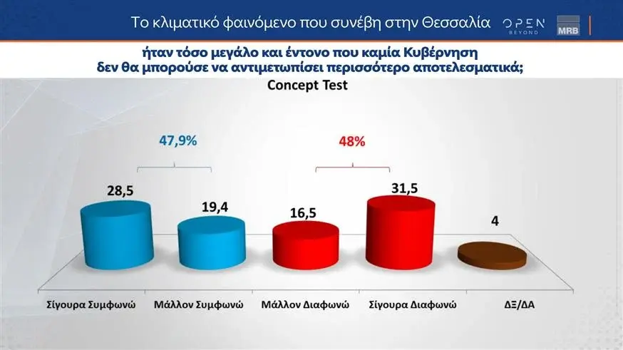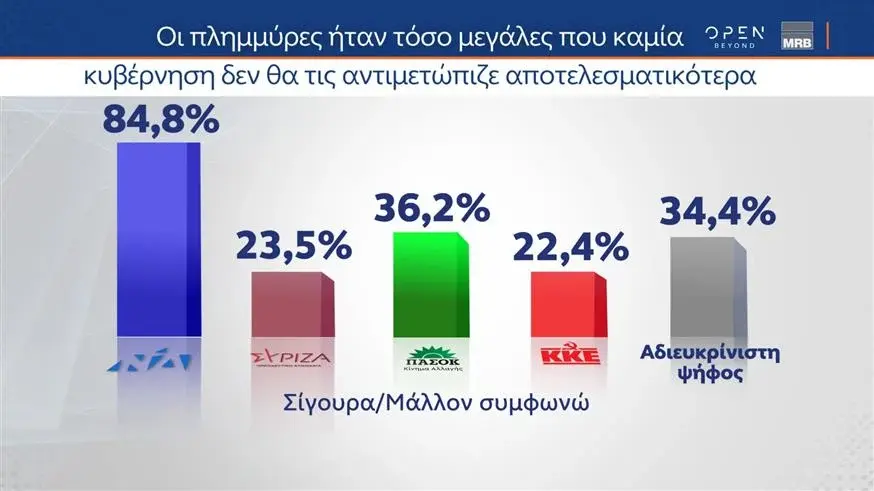 Διχασμένοι παρουσιάζονται οι πολίτες και στις ερωτήσεις σχετικά με τους κυβερνητικούς χειρισμούς στις καταστροφικές πλημμύρες της Θεσσαλίας. Κατά 47.9%, λοιπόν, υποστηρίζουν ότι, το φαινόμενο ήταν τόσο μεγάλο που, όποια κυβέρνηση και να ήταν δεν θα μπορούσε να το αντιμετωπίσει ενώ, κατά 48% σημειώνουν ότι κάποια άλλη κυβέρνηση θα το αντιμετώπιζε αποτελεσματικότερα.