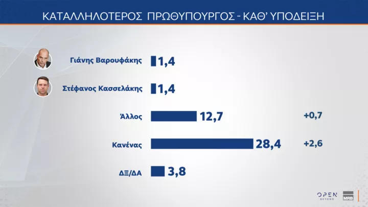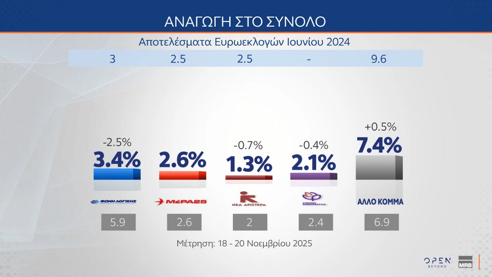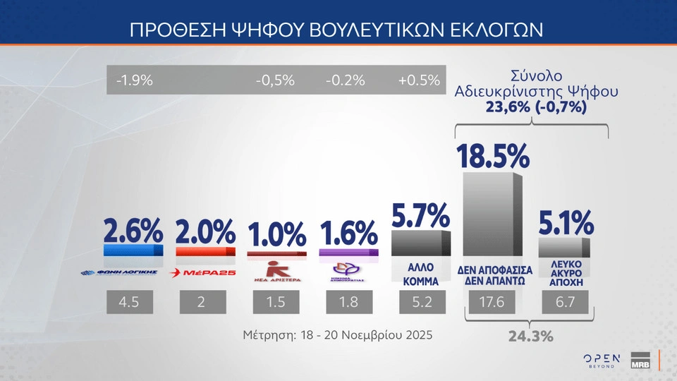 Ειδικότερα, η ΝΔ έχει ποσοστό 29,2%, ακολουθεί η Πλεύση Ελευθερίας με 13,2%, το ΠΑΣΟΚ και η Ελληνική Λύση έχουν 12,7%, με το ΚΚΕ να ακολουθεί στο 7,9%. Όσον αφορά τα υπόλοιπα κόμμα, ο ΣΥΡΙΖΑ έχει 4,6%, η Φωνή Λογικής 3,4%, η Νίκη 2,9%, η ΜέΡΑ 25 2,6%, το Κίνημα Δημοκρατίας 2,1% και η Νέα Αριστερά 1,3%. Όσον αφορά την πρόθεση ψήφου, τα ποσοστά διαμορφώνονται ως εξής: ΝΔ 22,3%, Πλεύση Ελευθερίας 10,1%, ΠΑΣΟΚ 9,7%, Ελληνική Λύση 9,7%, ΚΚΕ 6%, ΣΥΡΙΖΑ 3,5%, Φωνή Λογικής 2,6%, Νίκη 2,2%, ΜέΡΑ 25 2%, Κίνημα Δημοκρατίας 1,6%, Νέα Αριστερά 1%. Παράλληλα, ο Κυριάκος Μητσοτάκης λαμβάνει 23,2% στην καταλληλότητα για πρωθυπουργός, με δεύτερη την Ζωή Κωνσταντοπούλου που λαμβάνει 10,7%. Eντύπωση προκαλεί πως ο πρόεδρος του ΣΥΡΙΖΑ Σωκράτης Φάμελλος καταγράφει ποσοστό 0,5%.