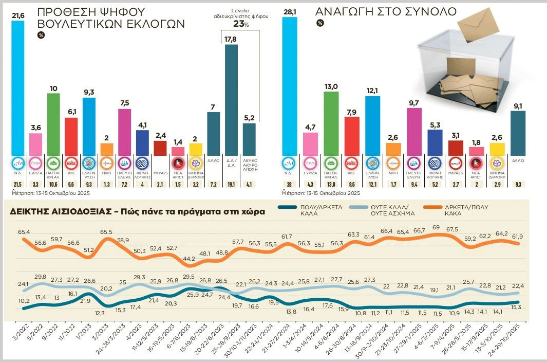 Σε υψηλά επίπεδα (23%) παραμένει η αδιευκρίνιστη ψήφος, που λειτουργεί ως δεξαμενή αβεβαιότητας και επιβεβαιώνει μια φάση πολιτικής αναμονής και μετριοπαθούς αποστασιοποίησης από το εκλογικό σώμα.