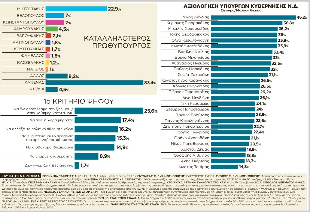 Ποια είναι τα κορυφαία προβλήματα των πολιτών και πώς αυτοί αξιολογούν τις κυβερνητικές πολιτικές; Σε αυτά και πολλά ακόμα ερωτήματα απαντά η δημοσκόπηση της MRB για τον «Ελεύθερο Τύπο». Σύμφωνα με τα ευρήματα, αποτυπώνεται η διατήρηση της κυριαρχίας του Κυριάκου Μητσοτάκη και της Νέας Δημοκρατίας στο πολιτικό σκηνικό απέναντι στους πολιτικούς αρχηγούς και τα κόμματα της αντιπολίτευσης.