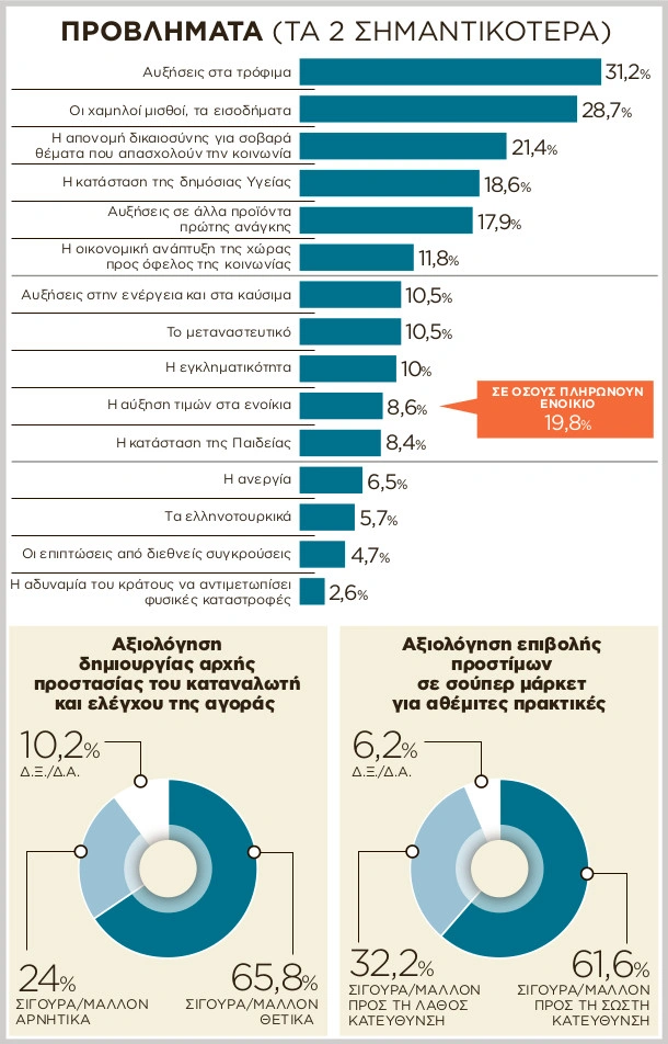 Η ακρίβεια σε τρόφιμα, είδη πρώτης ανάγκης και ενοίκια παραμένει το κορυφαίο πρόβλημα για τους πολίτες. Η ελληνική κοινωνία συνεχίζει να βιώνει έντονη πίεση στο επίπεδο διαβίωσης, με τα οικονομικά ζητήματα να διατηρούνται σταθερά στην κορυφή των ανησυχιών. Η παρούσα μέτρηση της MRB διαχωρίζει για πρώτη φορά τις επιμέρους πηγές των οικονομικών δυσχερειών: Αυξήσεις στα τρόφιμα (31,2%). Χαμηλοί μισθοί και εισοδήματα (28,7%). Αυξήσεις στα προϊόντα πρώτης ανάγκης εκτός τροφίμων (17,9%). Ενέργεια-καύσιμα (10,5%). Ενοίκια (8,6% στο σύνολο και 19,8% σε όσους ενοικιάζουν οικία).