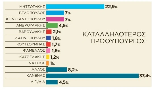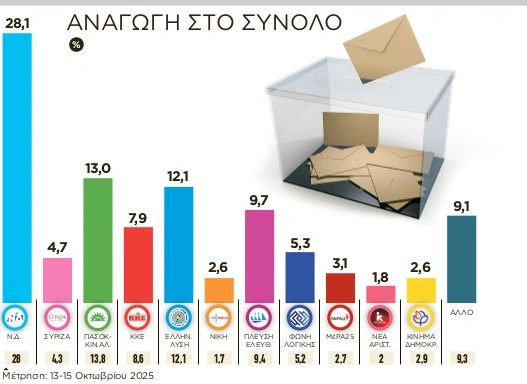 Αν και αυτή τη στιγμή δεν έχουν τεθεί εκλογικά διακυβεύματα για την επόμενη ημέρα, η Ν.Δ. συγκεντρώνει 28,1% (με άνοδο 0,1 της μονάδας σε δύο εβδομάδες) στην εκτίμηση ψήφου με αναγωγή στο σύνολο, ενώ ο Κυριάκος Μητσοτάκης κυριαρχεί στην πρωθυπουργική καταλληλότητα με 22,9%.