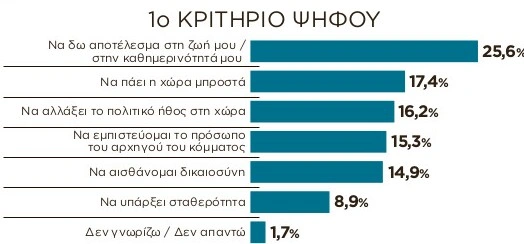Θετικό μήνυμα για την κυβέρνηση αποτελεί το ότι οι πολίτες εκτιμούν τη σταθερότητα, ωστόσο ζητούν μετρήσιμο έργο (51,9%: να δω αποτέλεσμα στη ζωή μου, να πάει η χώρα μπροστά) και ηθικό πρόσημο (46,4%). Η ιεράρχηση των κριτηρίων ψήφου δείχνει ότι η εκλογική συμπεριφορά διαμορφώνεται πλέον ελαφρώς λιγότερο από τα συναισθηματικά και περισσότερο από τα αξιολογικά κριτήρια, αποδεικνύοντας πως το αποτέλεσμα θα κριθεί από την αξιοπιστία στις πράξεις και όχι μόνο από την ένταση της ρητορικής.