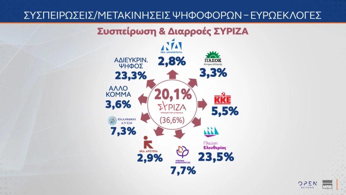 Η συσπείρωση του κυβερνώντος κόμματος ανέρχεται πλέον στο 75,4% από το 72% στο οποίο βρισκόταν στην μέτρηση του Μαρτίου. Οι μεγαλύτερες διαρροές της Νέας Δημοκρατίας εντοπίζονται προς την αδιευκρίνιστη ψήφο (7,5%) ενώ κατευθείαν προς την Πλεύση Ελευθερίας πηγαίνει το 4% των ψηφοφόρων της.