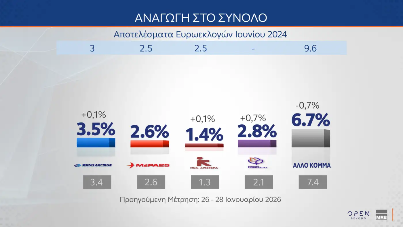 Σύμφωνα με τη δημοσκόπηση της MRB που παρουσιάστηκε στο κεντρικό δελτίο ειδήσεων του Open η Νέα Δημοκρατία προηγείται με 17,1 μονάδες του ΠΑΣΟΚ ενώ 8 κόμματα δείχνουν να μπαίνουν στην Βουλή. Αναφορικά με τον πόλεμο στη Μέση Ανατολή οι πολίτες είναι αντίθετοι στην εμπλοκή της χώρας μας με οποιονδήποτε τρόπο ενώ συμφωνούν με την αποστολή στρατιωτικής βοήθειας στην Κύπρο και με τους Patriot στην Κάρπαθο.