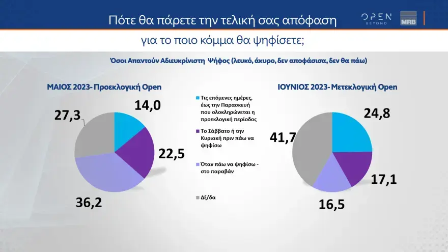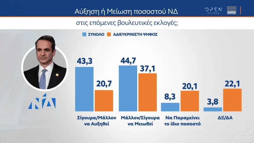 Το 37,1,% όσων δεν έχουν αποφασίσει, θεωρεί πως θα μειωθεί το ποσοστό της ΝΔ, το 20,7% πως θα αυξηθεί και το 20,1% πως θα μείνει στάσιμο.