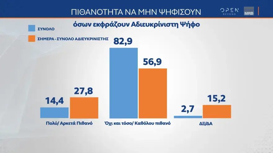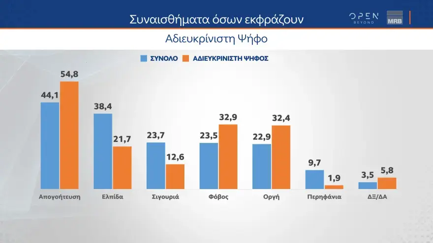 Το 54,8% των αναποφάσιστων αισθάνεται απογοήτευση, το 32,9% φόβο, το 32,4% οργή, το 21,7% ελπίδα, το 12,6% σιγουριά και το 1,9% περηφάνεια. Το 41,7% των αναποφάσιστων, απαντά πως δεν ξέρει πότε θα αποφασίσει για την ψήφο του, το 24,8% πως θα αποφασίσει έως την Παρασκευή πριν τις εκλογές, το 17% την Κυριακή πριν πάει να ψηφίσει και το 16,5% θα αποφασίσει στο παραβάν. Το 56,9% απαντά πως είναι απίθανο να μην ψηφίσει, ενώ το 27,8% πως είναι αρκετά πιθανό. Το 55,3% των αναποφάσιστων αξιολογεί αρνητικά το αποτέλεσμα των εκλογών και το 21,1% το αξιολογεί θετικά.