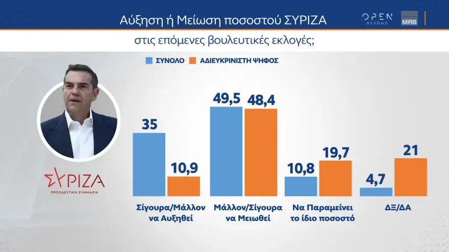 Το 48,4% απαντά πως σίγουρα θα μειωθεί το ποσοστό του ΣΥΡΙΖΑ, το 19,7% πως θα μείνει στάσιμο και το 10,9% πως θα αυξηθεί.