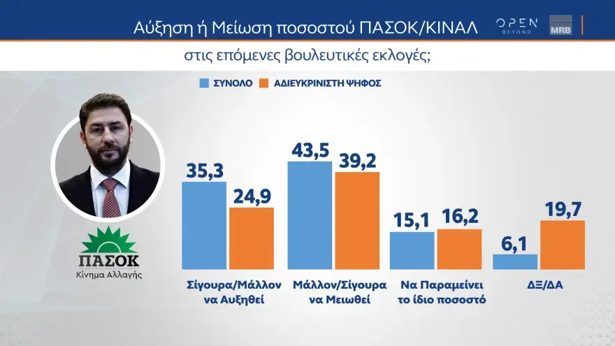 Αντίστοιχα, το 39,2% απαντά πως θα μειωθεί το ποσοστό του ΠΑΣΟΚ, το 24,9% πως θα αυξηθεί και το 16,2% πως θα παραμείνει στάσιμο.