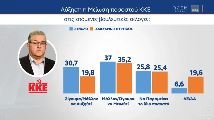 Το 35,2% εκτιμά πως θα μειωθεί το ποσοστό του ΚΚΕ, το 25,4% πως θα μείνει στάσιμο και το 19,8% πως θα αυξηθεί.