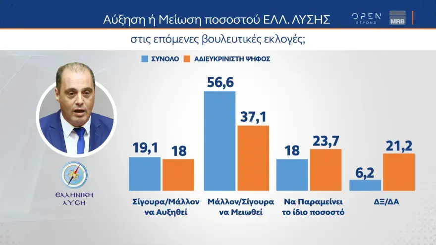Το 37,1% απαντά πως θα μειωθεί το ποσοστό της Ελληνικής Λύσης, το 23,7% πως θα μείνει στάσιμο και το 18% πως θα αυξηθεί.