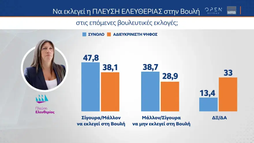 Το 38,1% εκτιμά πως η Πλεύση Ελευθερίας θα μπει στη Βουλή και το 28,9% εκτιμά πως δεν θα πιάσει το όριο του 3%.