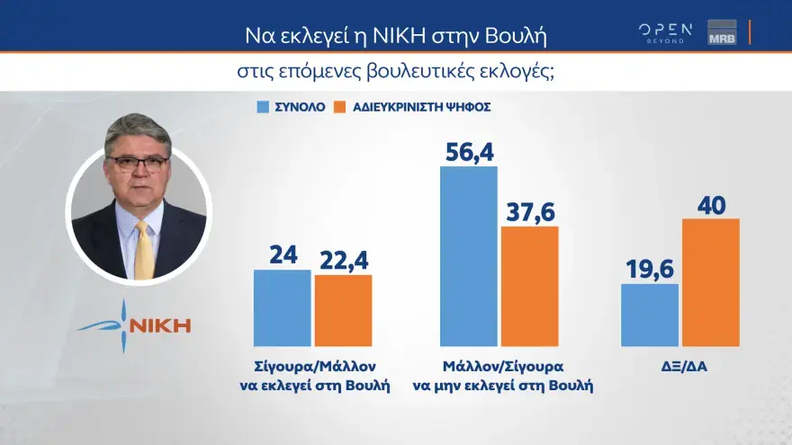 Το 37,6% εκτιμά πως δεν θα μπει στη Βουλή το κόμμα Νίκη, ενώ το 22,4% εκτιμά πως θα πιάσει το όριο εισόδου.