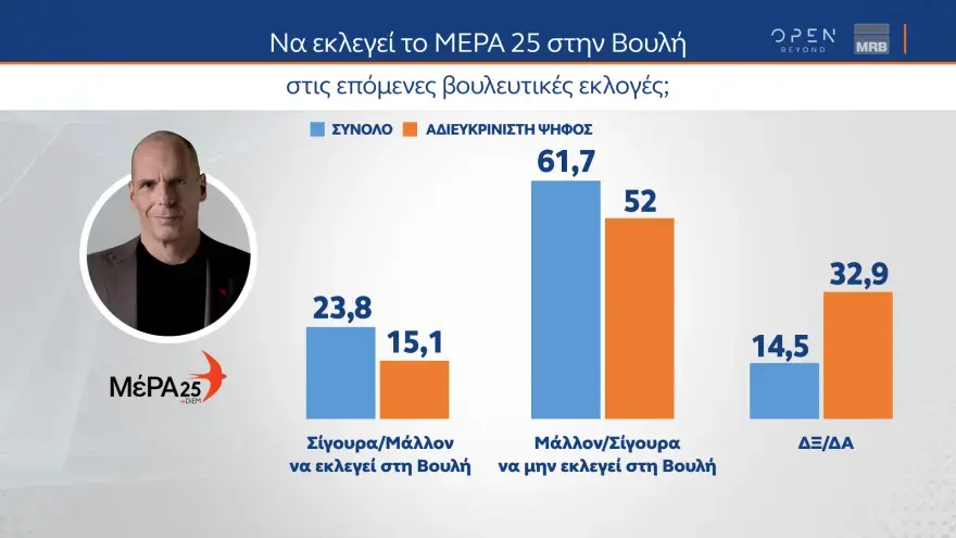 Το 52% των αναποφάσιστων θεωρεί πως το ΜέΡΑ25 δεν θα μπει στη Βουλή και το 15,1% πως θα μπει.
