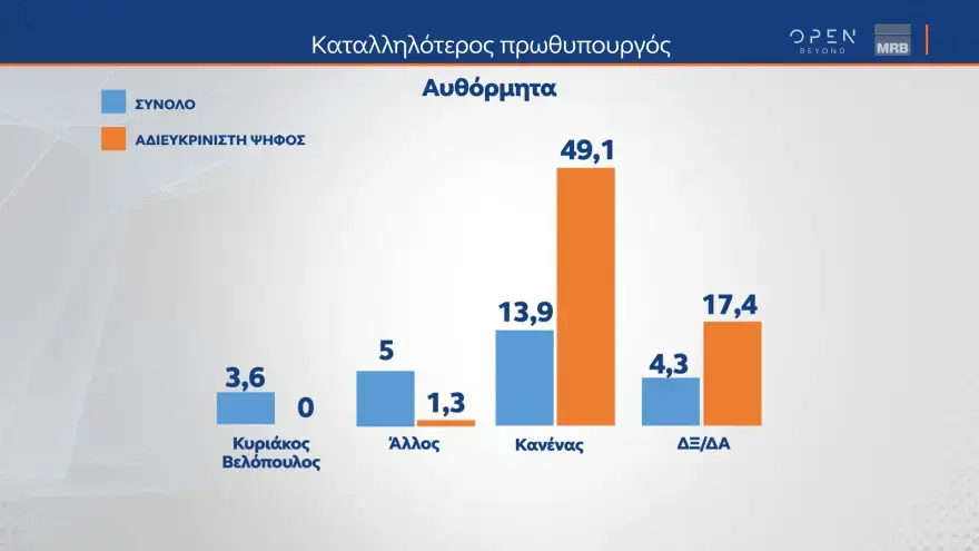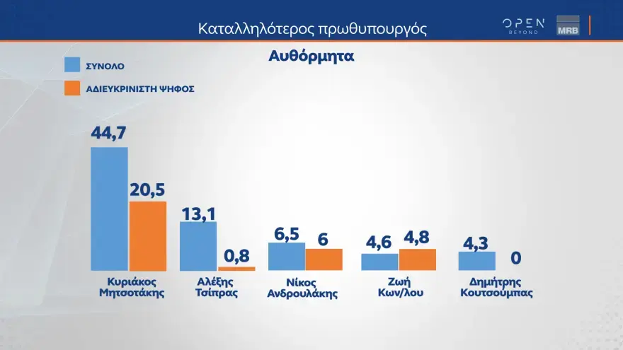 Από τους αναποφάσιστους, το 20,5% θεωρεί καταλληλότερο για πρωθυπουργό τον Κυριάκο Μητσοτάκη, το 6% το Νίκο Ανδρουλάκη, το 4,8% τη Ζωή Κωνσταντοπούλου και το 0,8% τον Αλέξη Τσίπρα. Το 49,1% απαντά «κανένας».