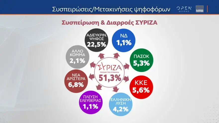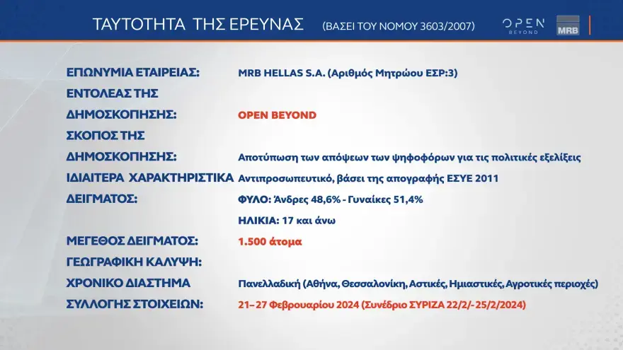 Στα ίδια ποσοστά με τον Ιανουάριο καταγράφεται η ΝΔ, ενώ κέρδη εμφανίζει το ΠΑΣΟΚ, σε σχέση με τον προηγούμενο μήνα. Την ίδια στιγμή ο ΣΥΡΙΖΑ εμφανίζει νέες απώλειες στον απόηχο του επεισοδιακού συνεδρίου του, που έληξε με επικράτηση των συμμάχων του Στέφανου Κασσελάκη. Είναι χαρακτηριστικό ότι το 41,2% εκείνων που είχαν ψηφίσει ΣΥΡΙΖΑ εκτιμούν ότι την επόμενη μέρα το κόμμα θα είναι αποδυναμωμένο, ενώ μόλις το 32% προβλέπει ότι θα ενισχυθεί.