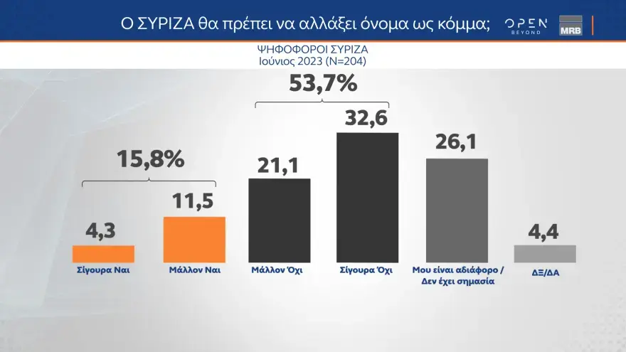 Το 53,7% δεν θέλει αλλαγή ονόματος του ΣΥΡΙΖΑ, ενώ το 15,8% θέλει αλλαγή ονόματος.