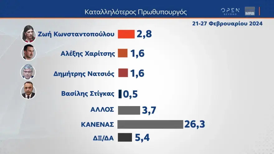 Καταλληλότερος για πρωθυπουργός ο Κυριάκος Μητσοτάκης με 28,9%, ενώ ακολουθούν ο Στέφανος Κασσελάκης με 7,7%, ο Κυριάκος Βελόπουλος με 7,4%, ο Νίκος Ανδρουλάκης με 7,2% και ο Δημήτρης Κουτσούμπας με τον Γιάνη Βαρουφάκη που συγκεντρώνουν από 3,5% έκαστος. Ακολουθεί η Ζωή Κωνσταντοπούλου με 2,8%.