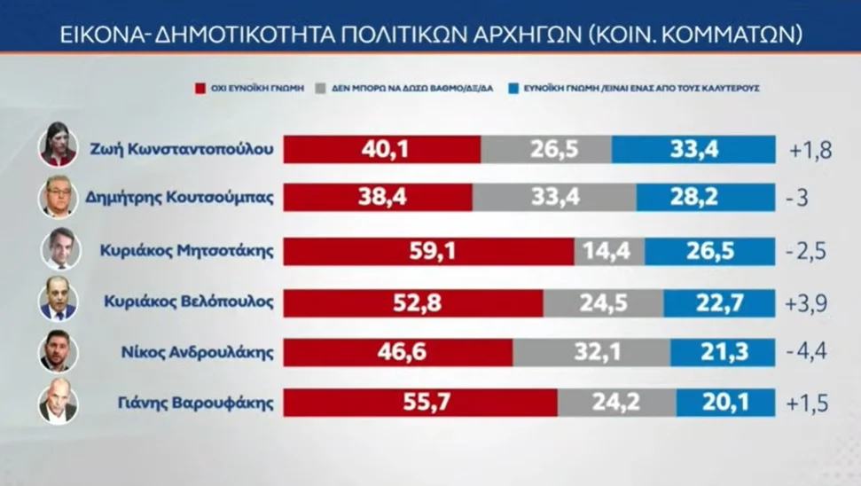 Αναφορικά με τη δημοτικότητα των πολιτικών αρχηγών, η δημοσκόπηση δίνει την πρώτη θέση στη Ζωή Κωνσταντοπούλου. Ειδικότερα, τα αποτελέσματα είναι: